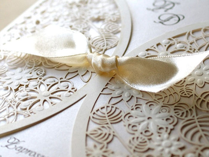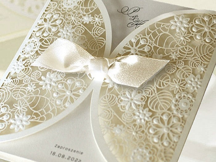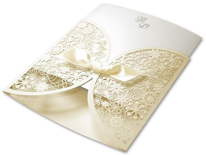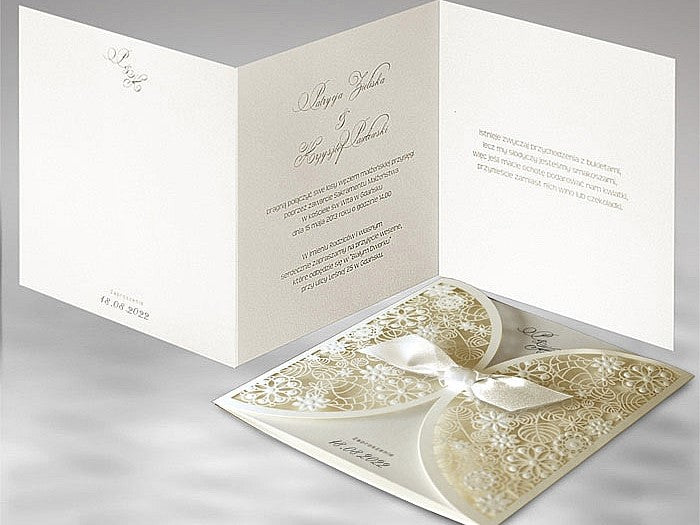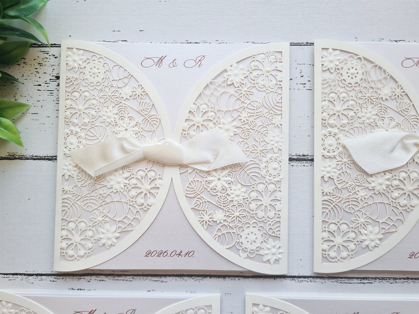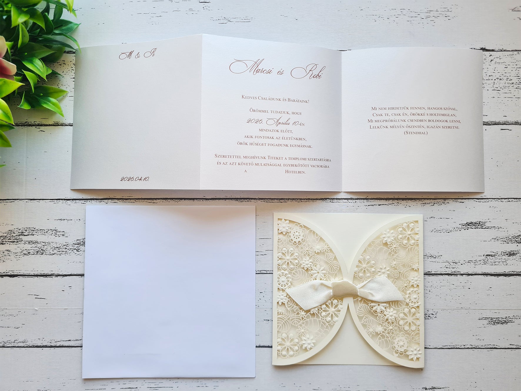 Ez a csodálatos ekrü színű meghívó igazán különleges megjelenésével és finom részleteivel az elegancia és a kifinomultság tökéletes példája.
