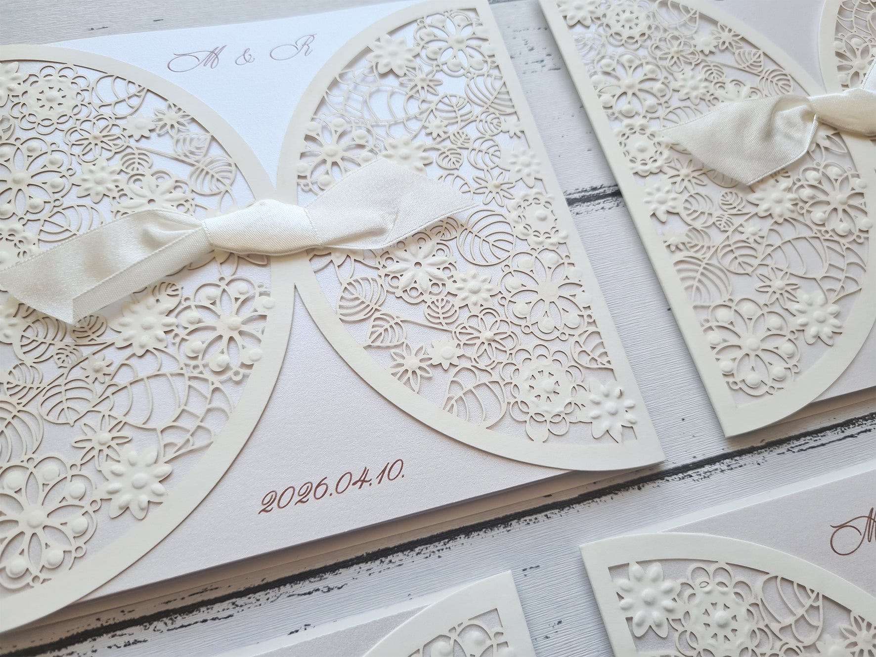 A borító elején elhelyezett ekrü színű selyemszalag elegáns kiegészítője a meghívónak, amely ízlésesen hangsúlyozza a design összhangját.