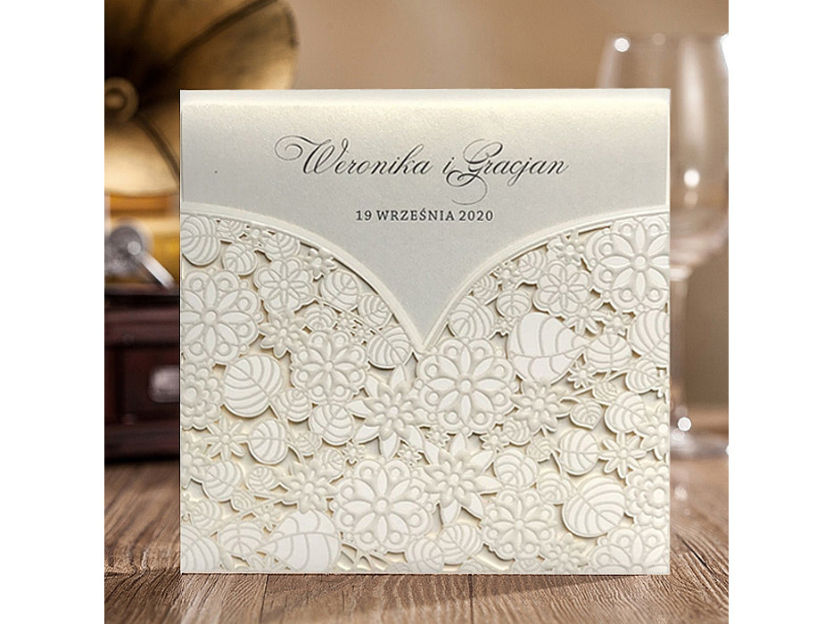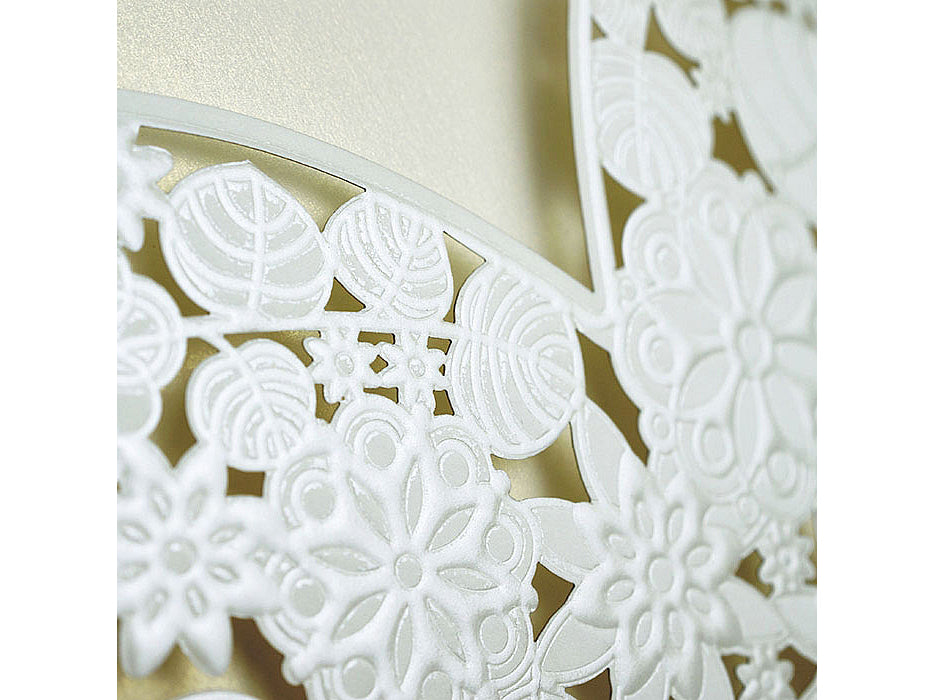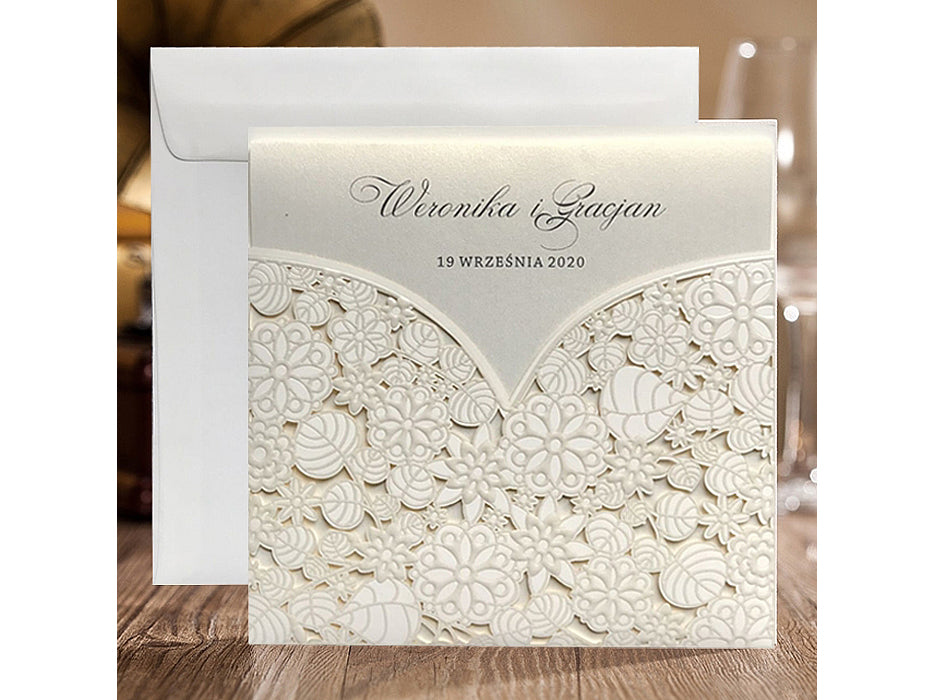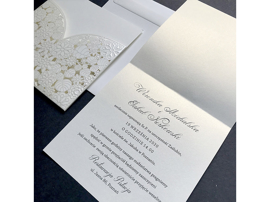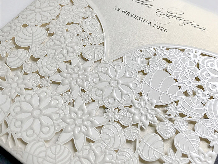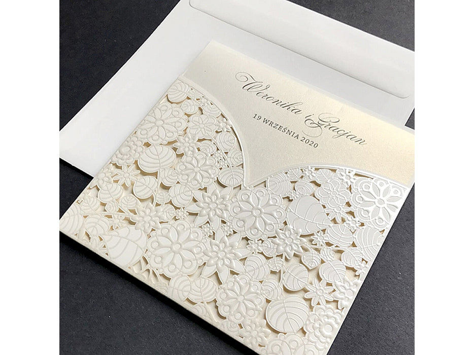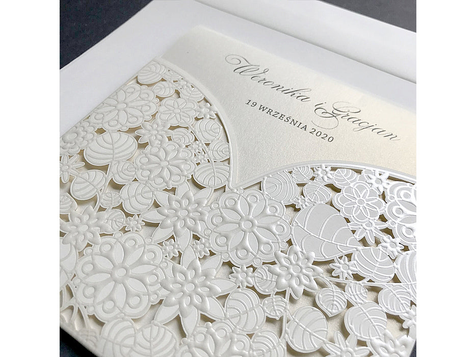 A gyöngyház krém betétlap kifinomult megjelenést kölcsönöz a meghívónak, a finom fény és csillogás pedig még inkább emeli a dizájn eleganciáját. A dombornyomott virágmintával kivágott krém színű borító nemcsak esztétikailag vonzó, hanem a tapintás élményét is fokozza, hiszen a dombornyomott részletek különleges textúrát adnak a meghívónak.