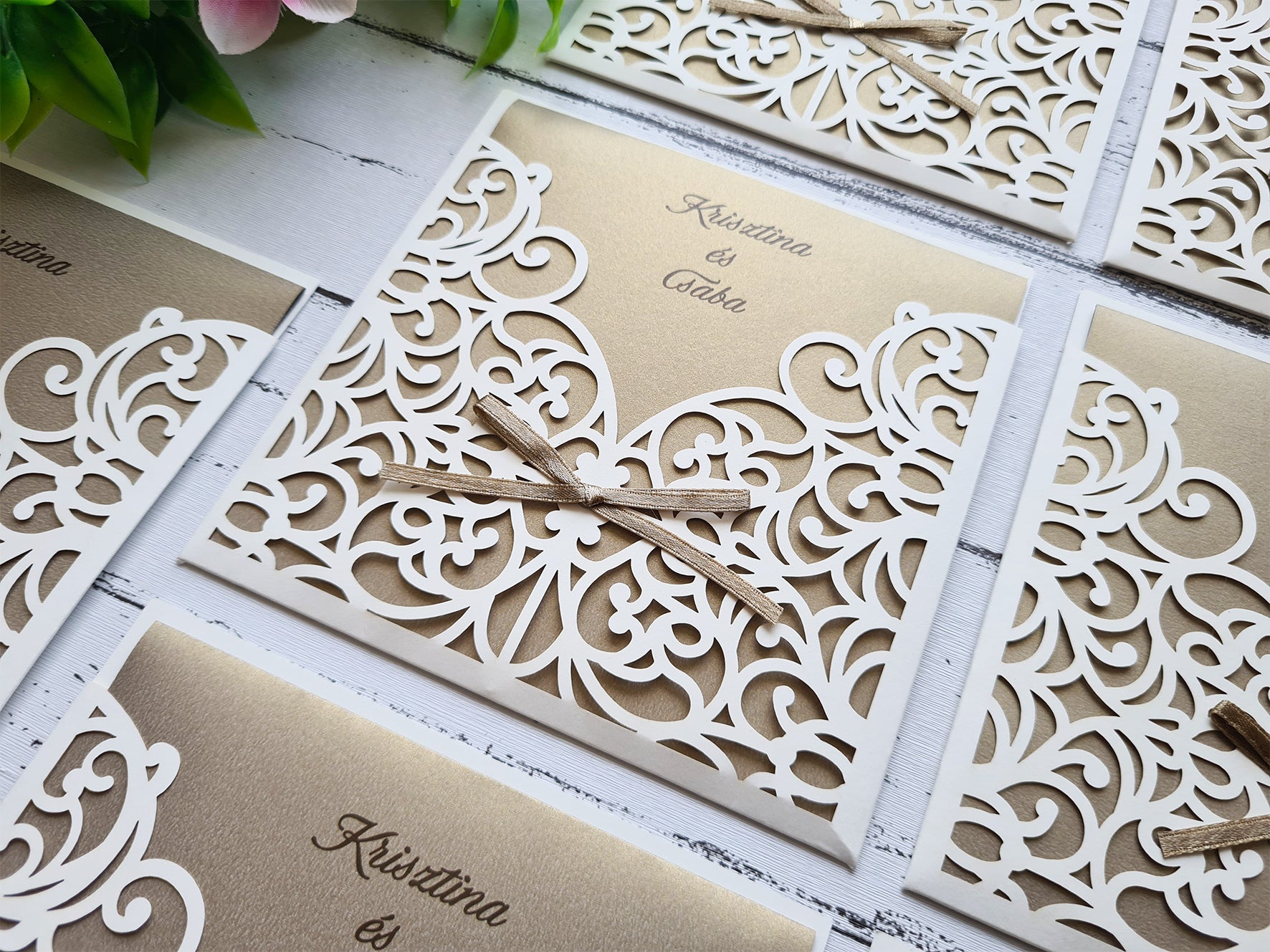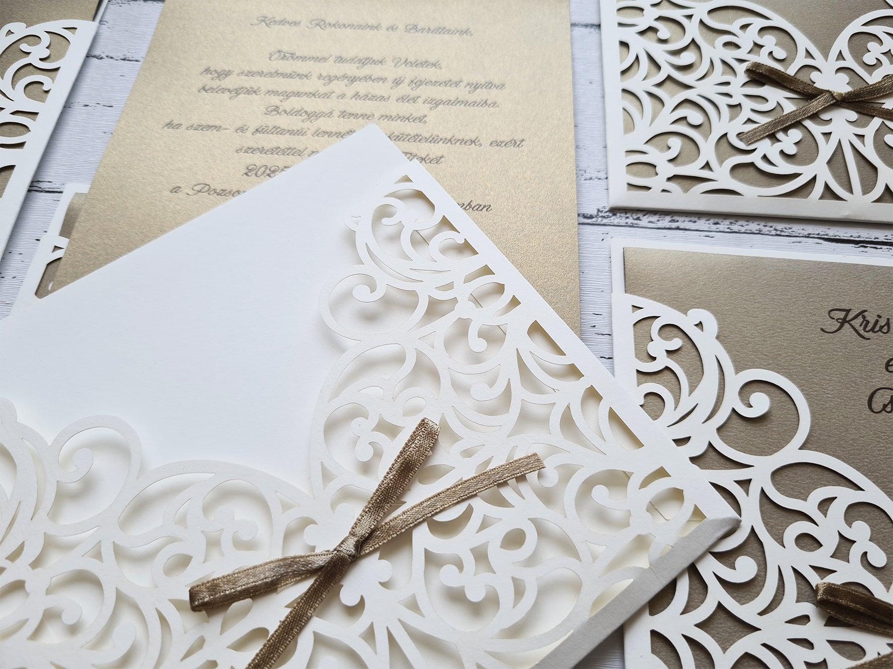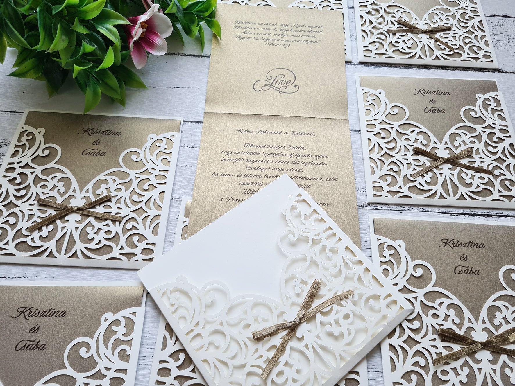 Az ekrü színű lézervágott borító elegáns és modern megjelenést kölcsönöz a meghívónak, amely tökéletes választás bármilyen ünnepi alkalomra.