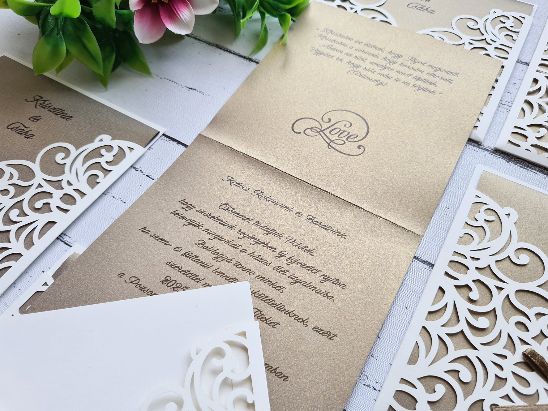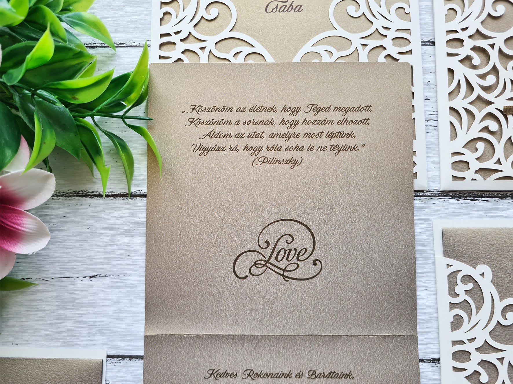 A metálosan fénylő arany/bronz felnyitható betétlap nemcsak esztétikai élményt nyújt, hanem praktikus megoldást is kínál hosszabb szövegek elhelyezésére, így bőséges információt adhatunk meg a meghívottak számára.