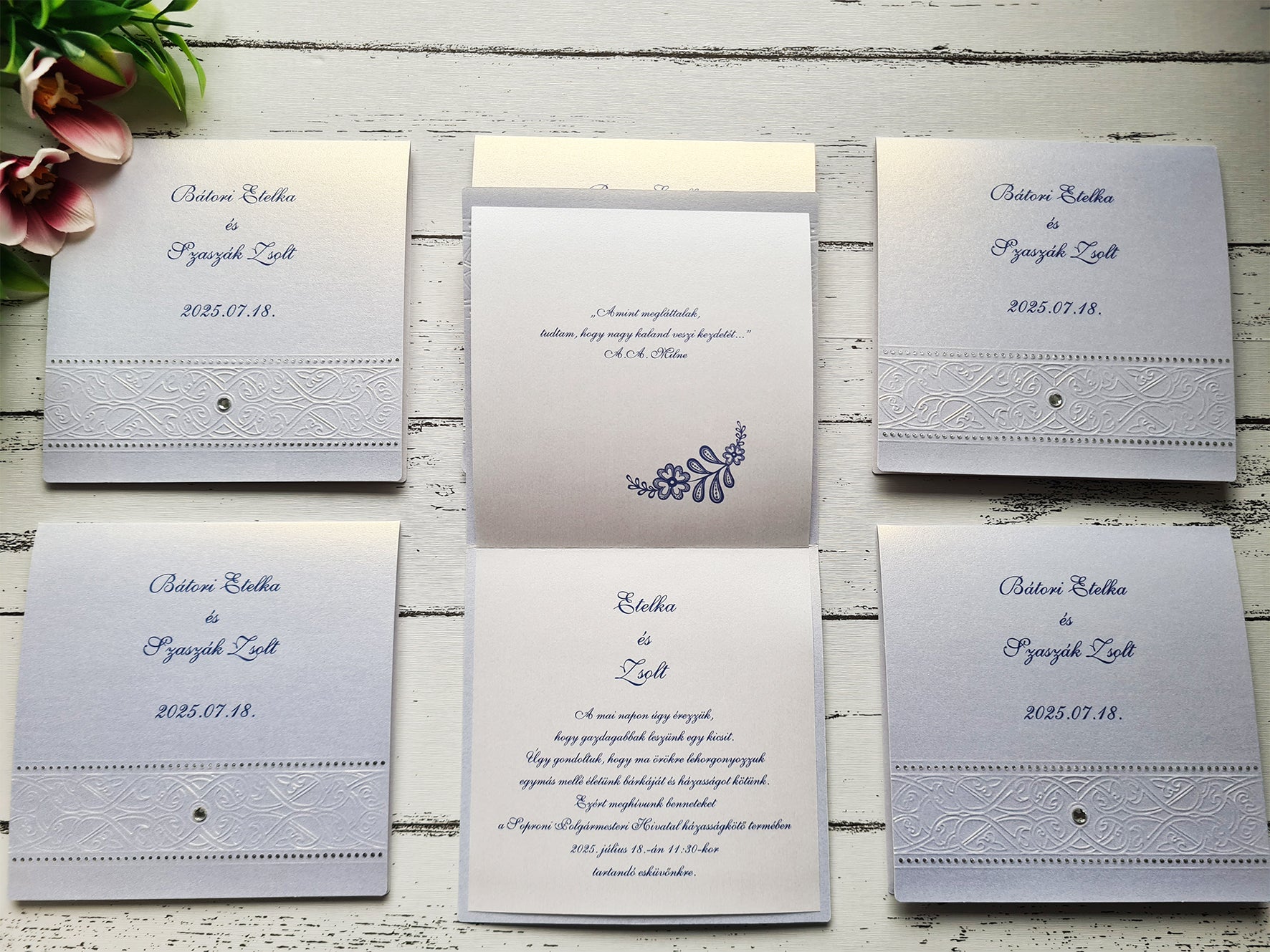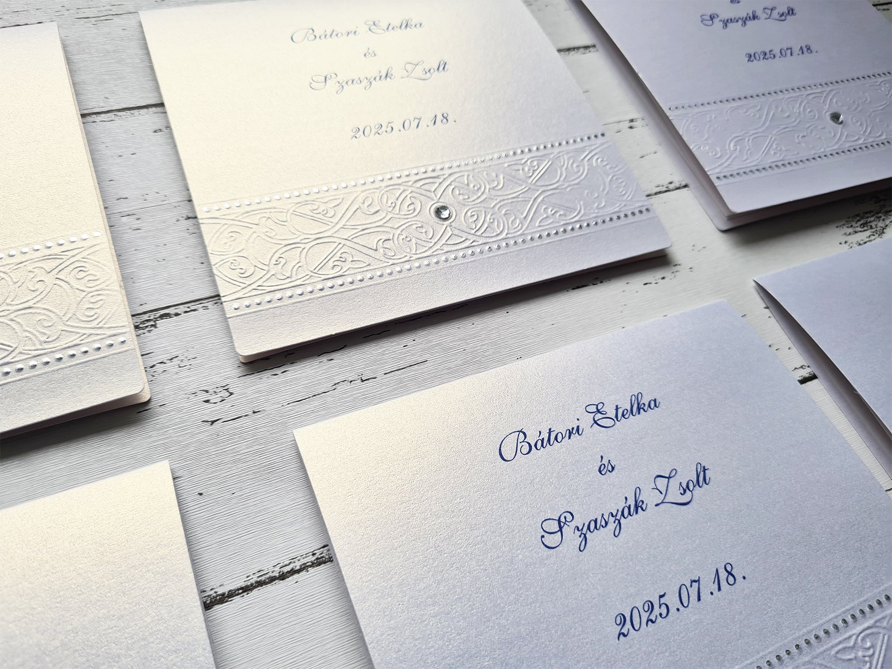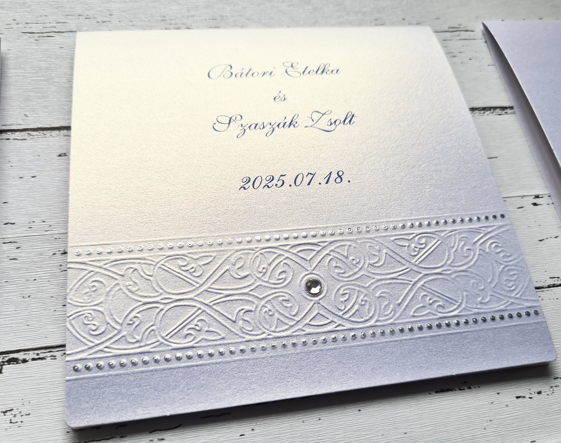 A díszítés során használt fényes ezüst pöttyök finom csillogást kölcsönöznek, amely még inkább kiemeli a borító eleganciáját. A strasszkő, amely a borító egyik figyelemfelkeltő eleme, egyedi és exkluzív megjelenést biztosít, így a meghívó valóban különlegessé válik. A strasszkő elhelyezése gondos tervezés eredménye, amely tökéletesen harmonizál a dombornyomott mintával és az ezüst pöttyökkel.