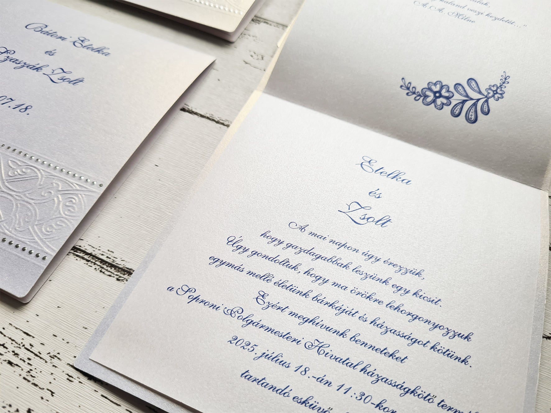 Az meghívó rendkívül elegáns és kifinomult megjelenésével azonnal magára vonja a figyelmet. A gyöngyházfehér felnyitható borító nemcsak esztétikus, hanem különleges fényt is tükröz, amely a luxus érzetét kelti. A borító textúrája dombornyomott indaminta díszítéssel van ellátva, ami mélységet és karaktert ad a meghívónak.
