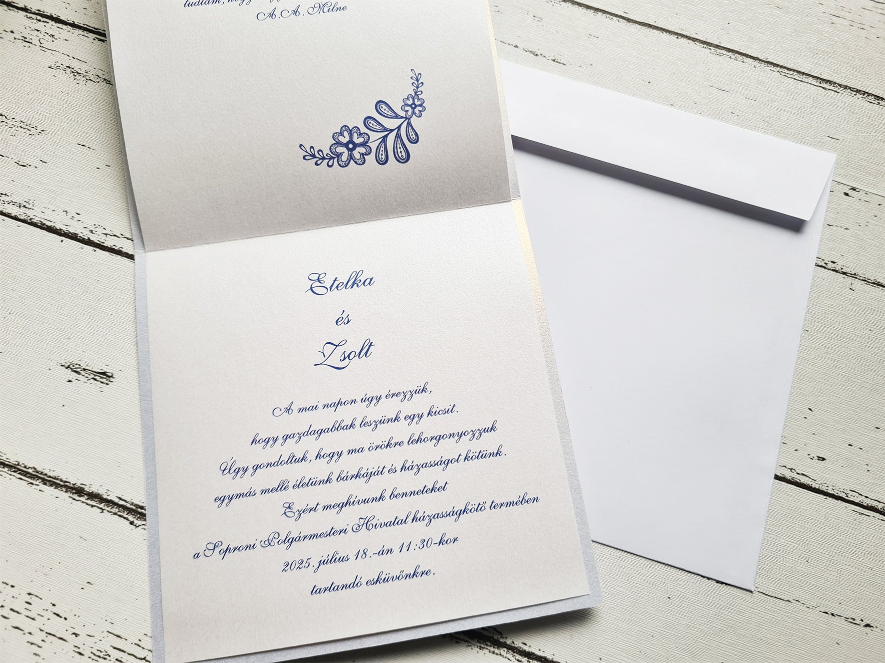 A belső matt fehér betétlap szintén felnyitható, így elegendő helyet biztosít a meghívottak számára szánt üzenetnek. A matt felület elegáns kontrasztot alkot a gyöngyházfehér borítóval, így a szöveg könnyen olvasható, és a meghívó összképe kifinomult marad.