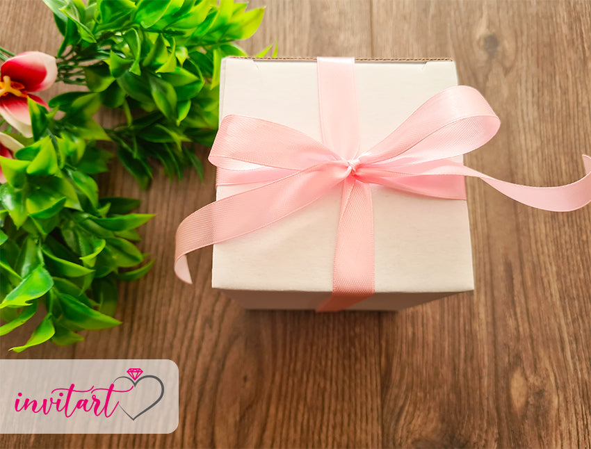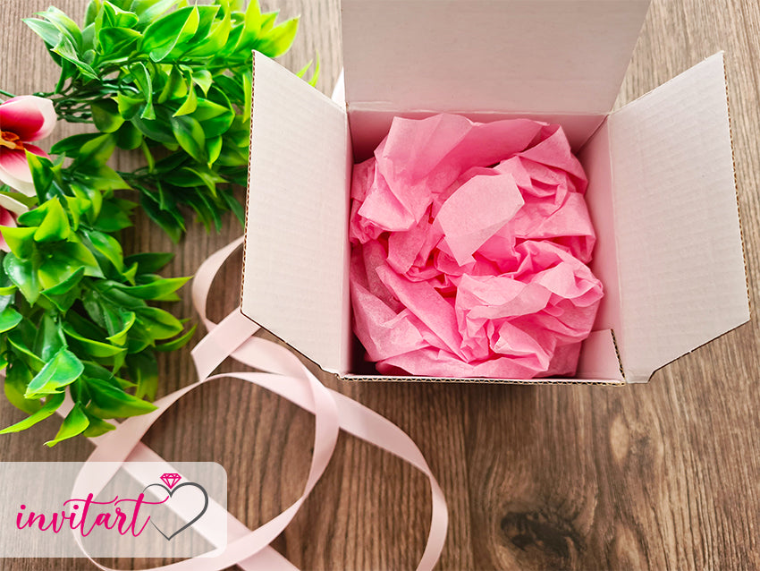 A gyertyát rózsaszín díszpapírba csomagoljuk, majd dobozba helyezzük és egy rózsaszín szalaggal átkötjük.