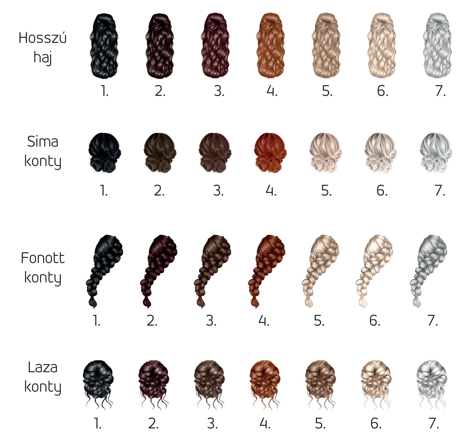 A menyasszony és koszorúslány/tanú hajtípusát és színét, kérjük megrendeléskor a megjegyzés rovatba írd bele.