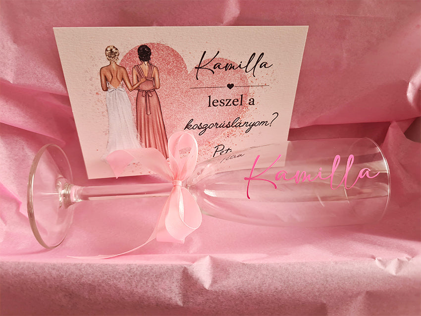 - rose gold felirattal készült névre szóló pezsgőspohár rose gold masnival