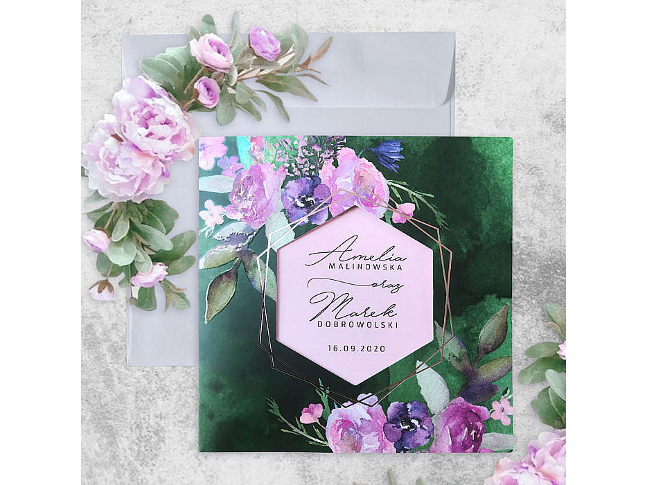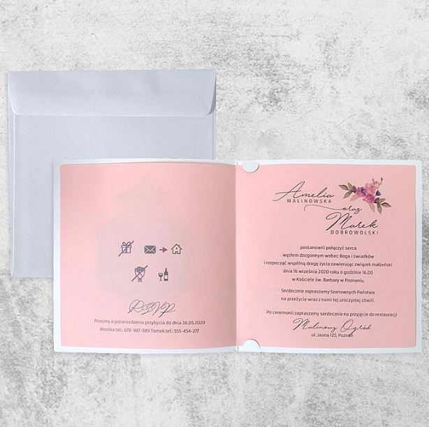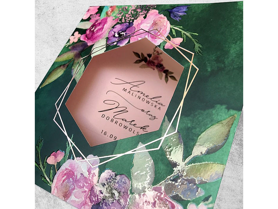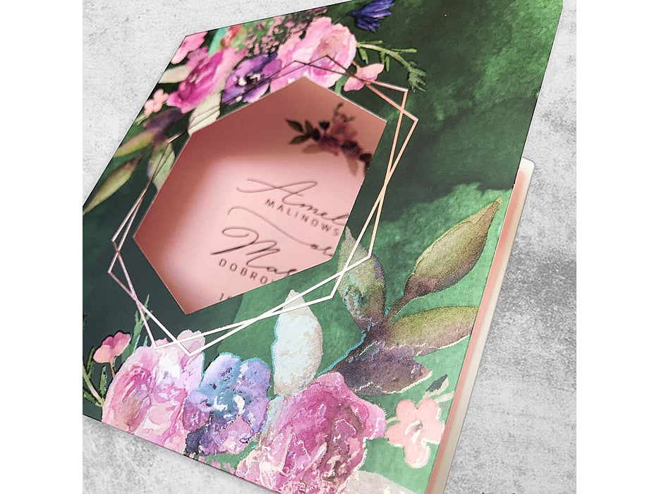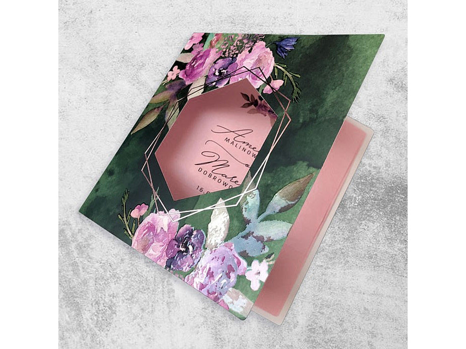 A rózsaszín kinyitható betétlap remek kontrasztot alkot a sötétzöld borítóval. A rózsaszín árnyalata barátságos és meleg érzetet kelt, ami a meghívottakat az esemény otthonos és romantikus hangulatába vezeti. A betétlap kényelmesen elég helyet biztosít egy hosszú szöveg számára, amelyben a pár személyes üzenetét, a helyszínt, az időpontot és egyéb fontos részleteket is megoszthatják.