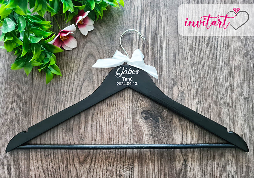 Fa fekete vállfa, egyediesítve, szatén szalaggal.
