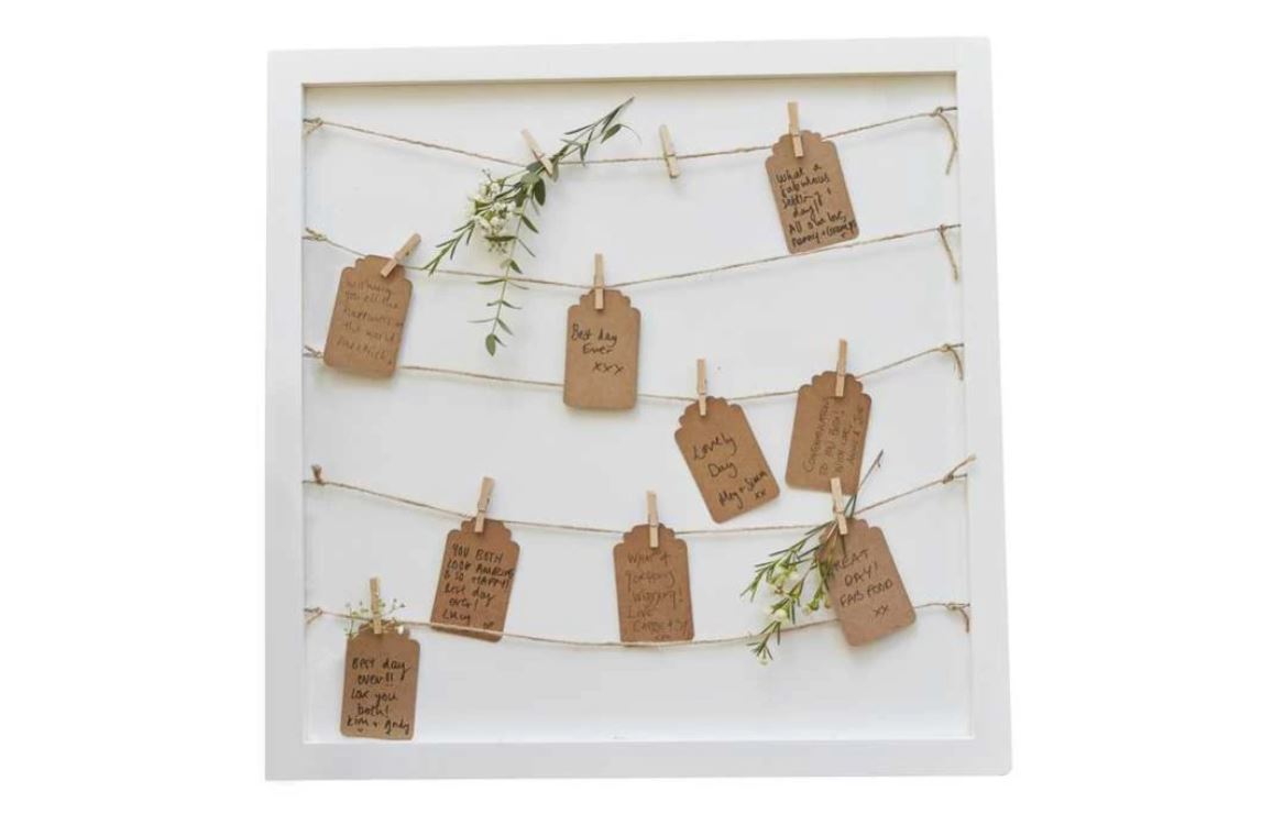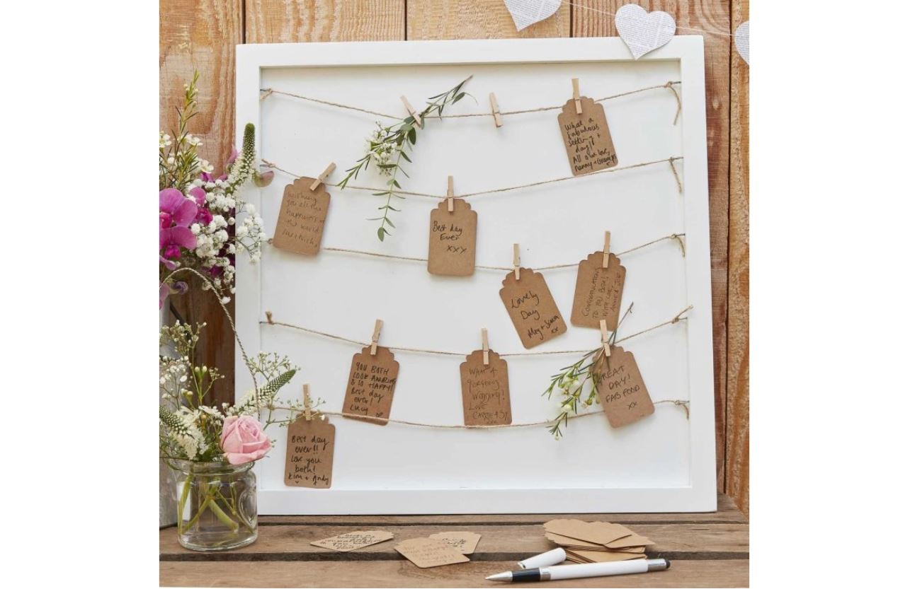 Fehér fakeretes vendégkönyv vagy ültetési rend – juta madzaggal, csipeszekkel és kártyákkal, amelyre a vendégek felírhatják jókívánságaikat. Egyedi, dekoratív megoldás, amely akár ültetési rendként is használható.